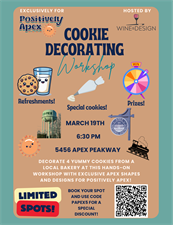 Register at https://www.wineanddesign.com/calendar/apex-nc/event/cookie-decorating-with-positively-apex-630pm-830pm